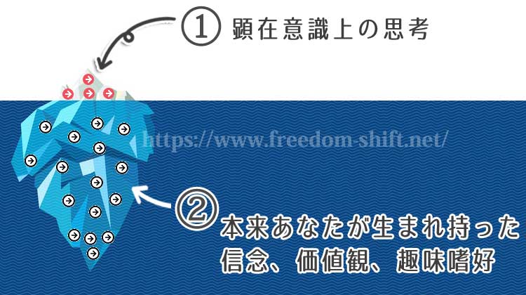 この状態が潜在意識が2層に分かれてしまっている状態で、その時に優位に働いているのは後付けで張ってきた信念です。