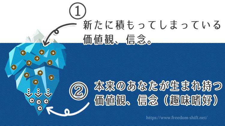 この時、あなた本来の信念は消える事はありませんが、後から入ってきたネガティブな働きをしてしまう信念に覆い隠されてしまいます。